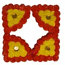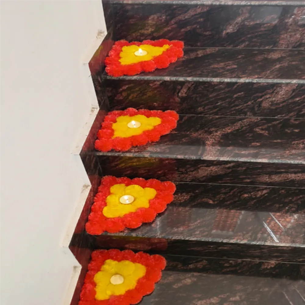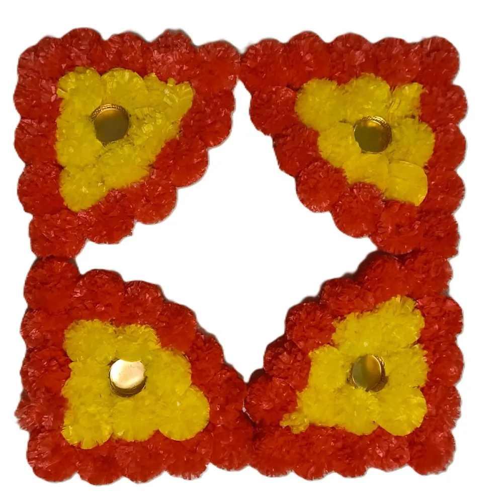 Beautiful Corner Rangoli made with vibrant artificial flowers on a strong MDF base. Designed with built-in tealight holders for a festive glow, this 4-piece set is perfect for Diwali, Navratri, pooja room and home entrance décor. Easy to place, reusable and mess-free, it adds an elegant traditional touch to any space. Ideal for Indian festivals, housewarmings and celebrations.
