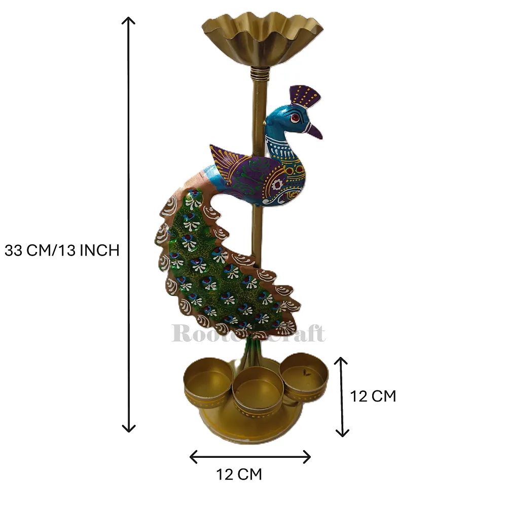 Bring timeless elegance to your home with this Hand Painted Peacock Design Tea Light Holder, crafted from metal and finished in vibrant multicolour detailing. Measuring 33×12×12 cm, this artistic décor piece beautifully holds tea lights, creating a warm festive glow. Ideal for Diwali decoration, pooja rooms, living spaces, gifting, and Indian ethnic home décor.