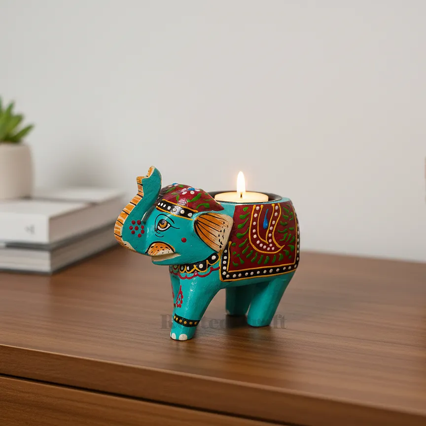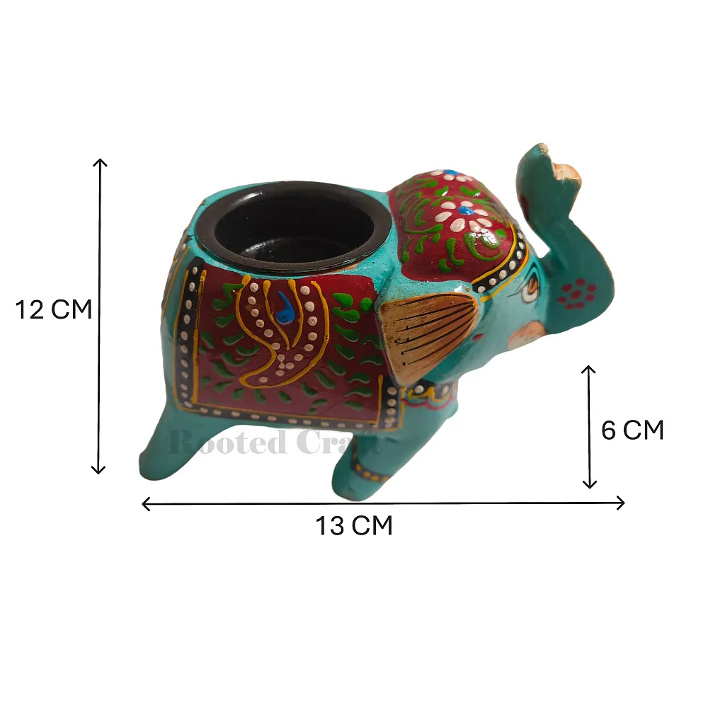 A beautifully hand-painted blue wooden elephant tea light holder crafted in vibrant Rajasthani style. Adds a warm festive glow to living rooms, pooja spaces, centre tables and décor corners. Made from premium wood and includes a tea light candle. Perfect for Diwali, gifting and daily home styling. Size: 13 x 12 x 6 cm.