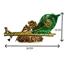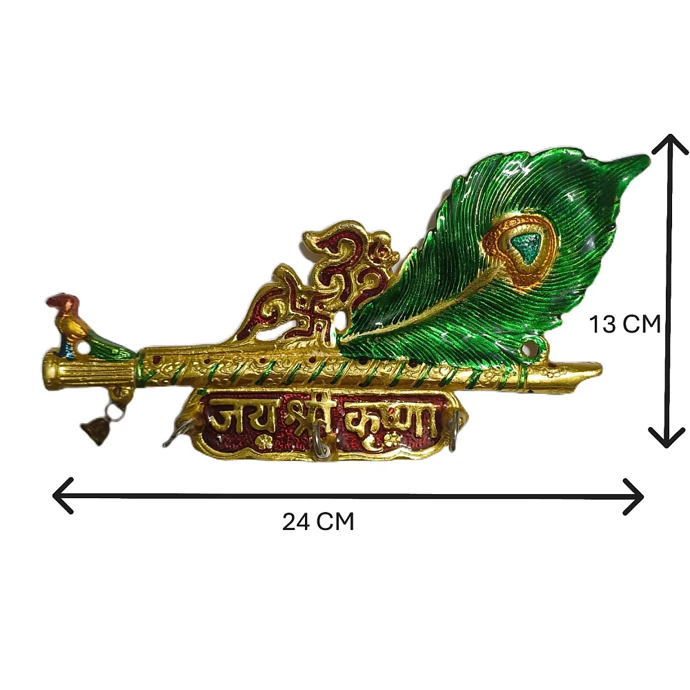 A beautifully crafted metal Krishna flute key holder with a vibrant green peacock feather and golden finish. Features 3 strong hooks for keys and small accessories. Perfect for entrance, living room, or mandir décor. Durable, easy to install and adds a spiritual, elegant touch to any wall. Size: 24 x 13 x 4 cm.