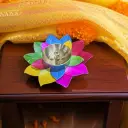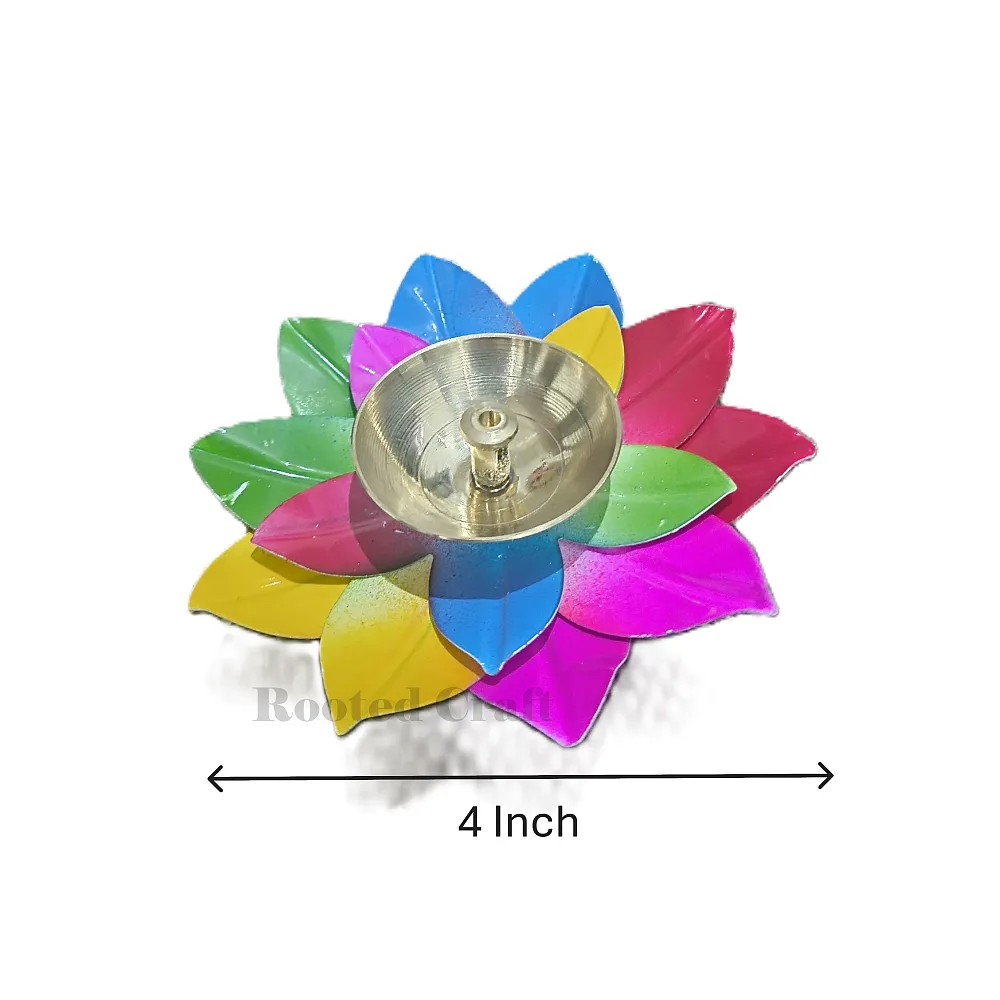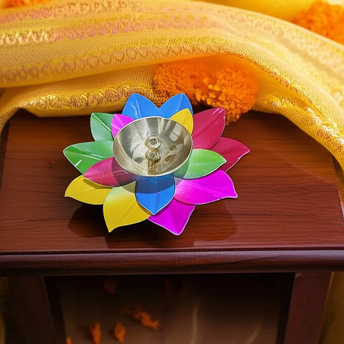 A vibrant multicolour lotus diya crafted with metal petals and a premium brass oil diya cup. Perfect for pooja, Diwali décor, temple setups and gifting. Its 4-inch compact size fits beautifully in Rangoli, pooja thalis and centre tables. Durable, elegant and ideal for creating a warm spiritual ambience. Size: 4 inch diameter, 1.5 inch height.