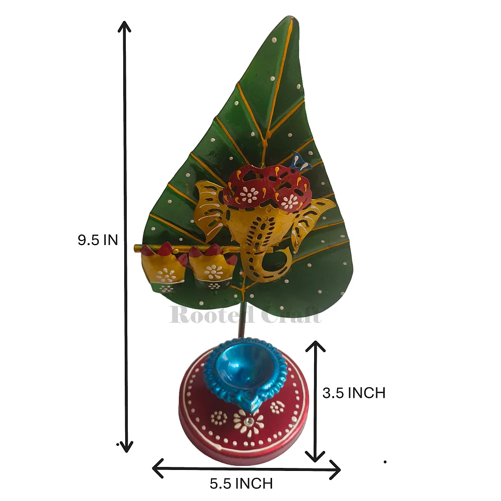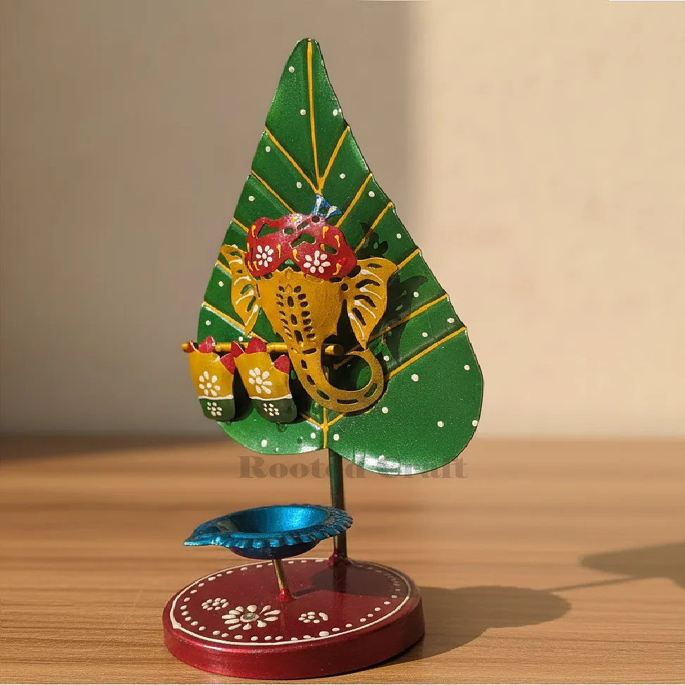 Pan Leaf Ganesh Metal T-Light Holder | Handcrafted Multicolour Tea Light Stand for Diwali & Pooja Room