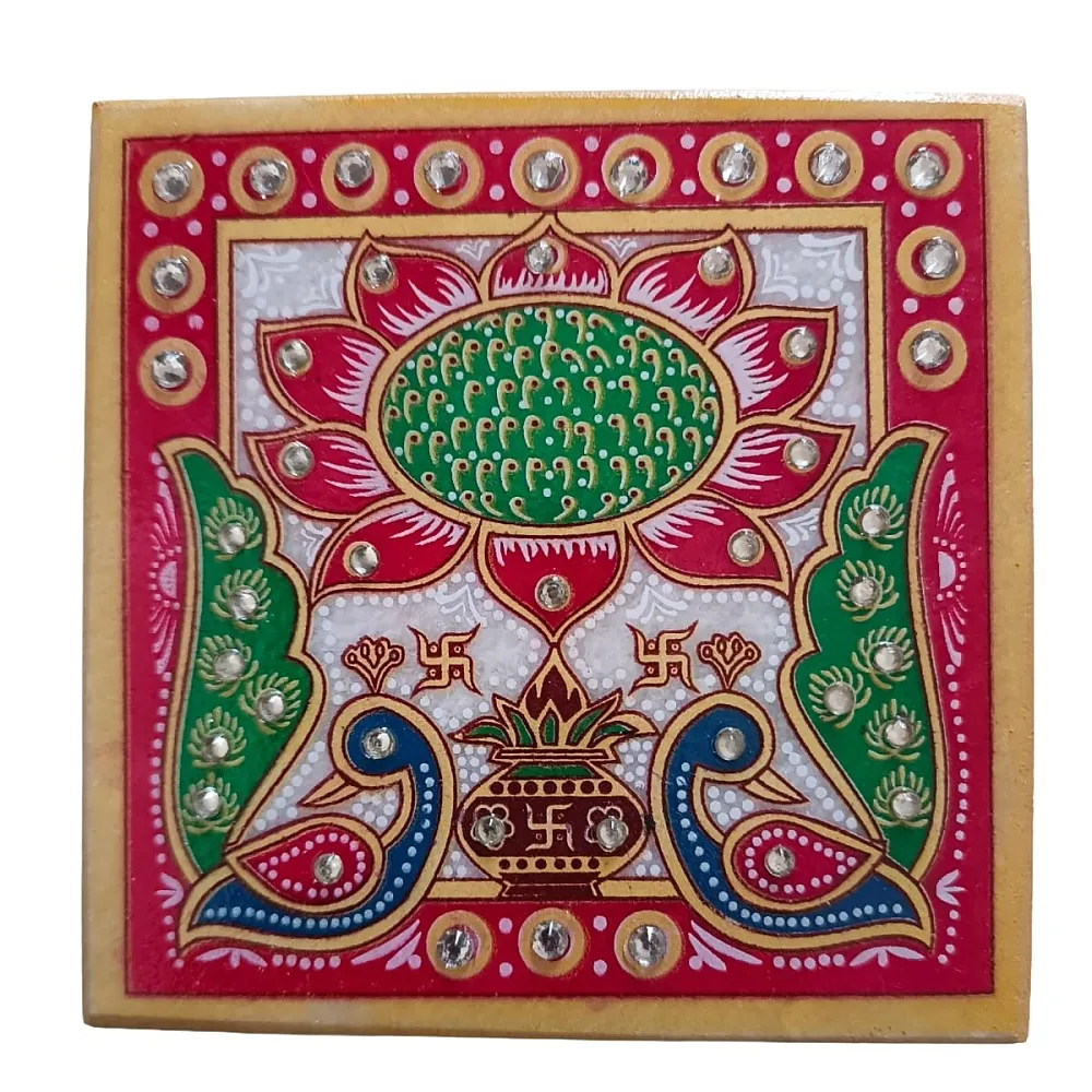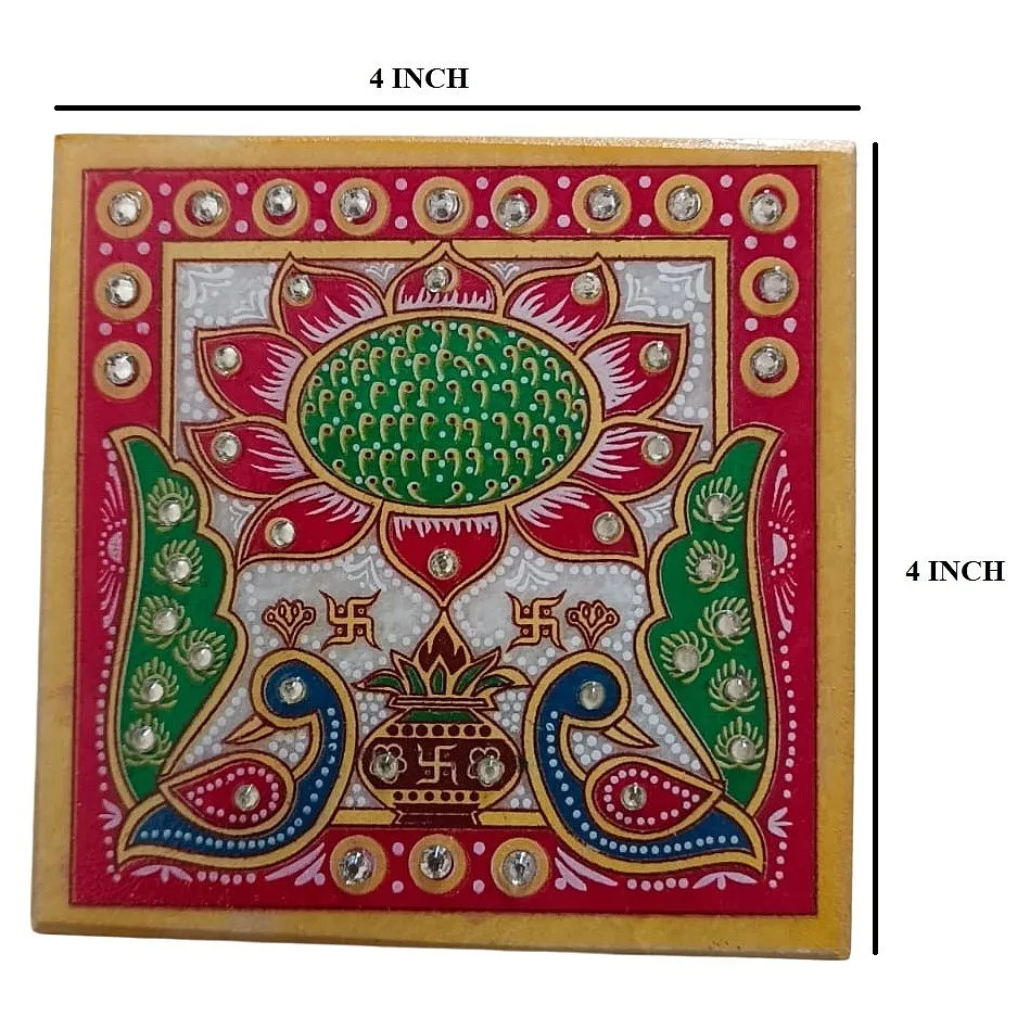 Handcrafted marble choki with traditional Rajasthani meenakari and stone work. Ideal for pooja, home mandir, Diwali decoration and gifting. This 4×4 inch chowki is perfect for placing Ganesh, Laxmi, diya or kalash during daily rituals and festivals. A premium handcrafted décor piece that adds elegance, colour and cultural charm to your spiritual space. Perfect for festive gifting.