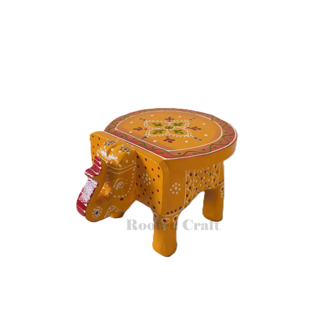 Handcrafted yellow wooden elephant stool by Rooted Craft, made with premium wood and traditional hand-painting. This vibrant Rajasthani elephant chowki is perfect for home décor, pooja mandir, kids’ room, planters and gifting. Compact, durable and beautifully designed to add ethnic charm to your space. Ideal for Diwali décor, housewarming gifts and Indian handicraft lovers.